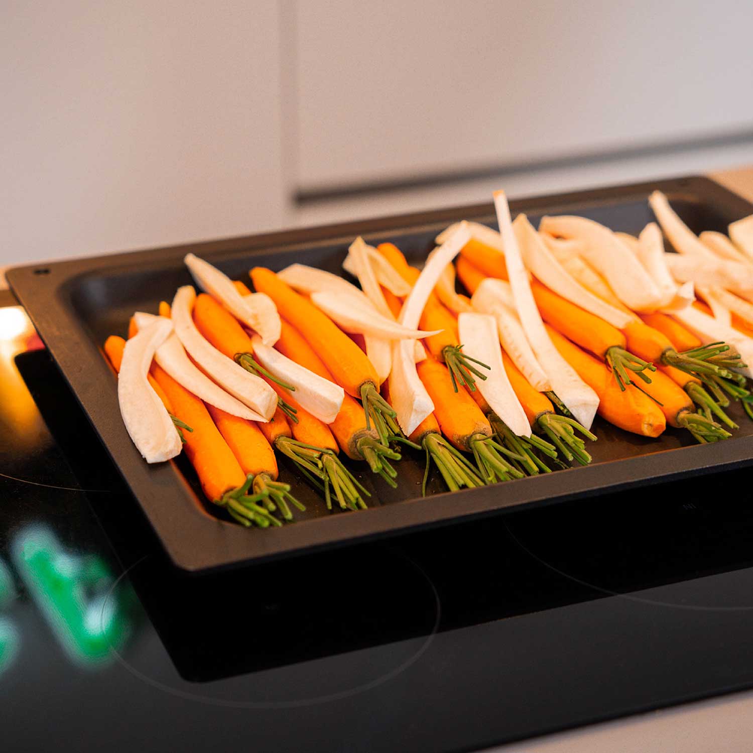 Unsere Alu-Backbleche haben mit einer Höhe von nur 3 Zentimetern einen niedrigen Rand. Dadurch kann die Luft im Backofen besonders gut zirkulieren und die Kekse, Pizza oder ein niedriger Blechkuchen werden knuspriger. Ein Alu-Backblech mit einem höheren Rand bietet sich bei saftigen Speisen wie Ofengemüse, Braten oder Aufläufen an.
