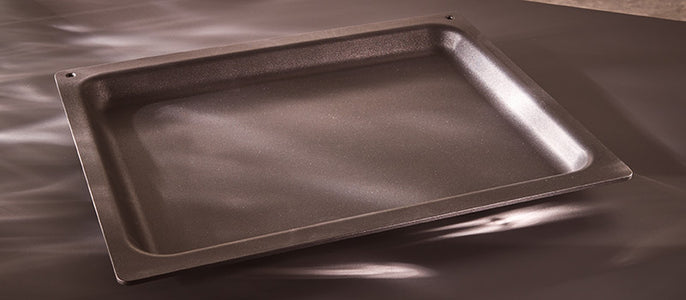 Unser Alu-Backblech erhalten Sie in drei Größen, die sich an den Backofenmaßen großer Hersteller wie Miele, Bosch oder AEG orientieren. Messen Sie den Abstand zwischen den Schienen Ihres Backofens oder ein bereits vorhandenes Blech, um die richtige Größe zu ermitteln. Alle Backbleche sind aus Aluminium-Guss gefertigt und mit einer Antihaftbeschichtung versehen.