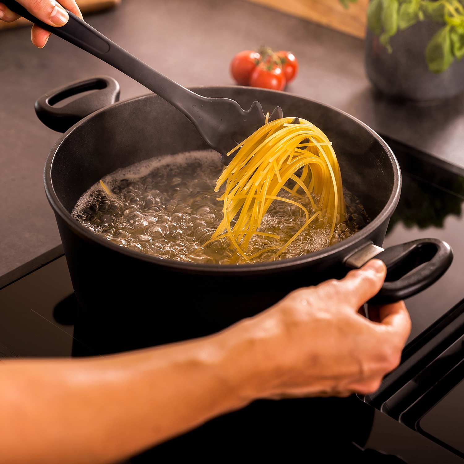 Haben Sie sich für einen Kochtopf von Hoffmann Germany entschieden, haben Sie genau die richtige Wahl getroffen. Die Modelle aus Aluguss erhitzen sich besonders schnell und sind je nach Ihrer Herdart binnen ein bis zwei Minuten heiß. Ein einfacher Trick hilft Ihnen dabei: Geben Sie einen Kochlöffel aus Holz in das Fett. Schlägt er am unteren Rand Blasen, ist das Fett heiß genug. Geben Sie dann erst ein Fett oder Öl Ihrer Wahl in den Kochtopf. Es ist auch möglich, dank der hochwertigen Antihaftbeschichtung, Ihre Lebensmittel ganz ohne Fett anzubraten. Mit einem passenden Deckel sind Sie bestens ausgestattetn, dieser sollte schon zu Beginn des Kochvorganges aufgesetzt werden. So sparen Sie Energie, da sich das Innere schneller erwärmt. Zudem hält er das Gargut im Topfinneren saftig.