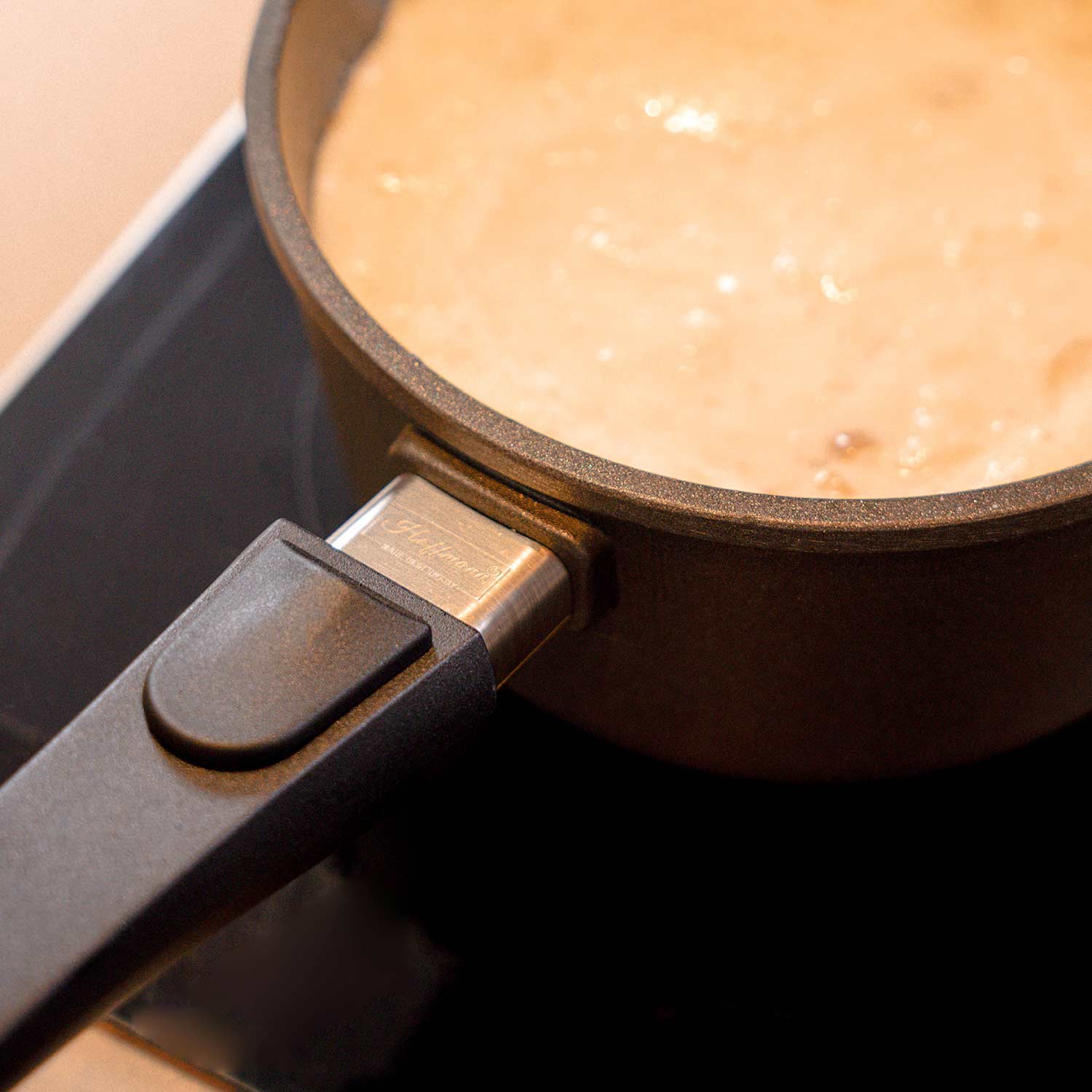 Neben dem allseits bekannten Edelstahl und dem Gusseisen gibt es handlichere, langlebige Alternativen, die sowohl für Induktion als auch jede andere Herdart geeignet sind. Das Team rundum Hoffmann Germany hat bemerkt, dass sich im Laufe der Zeit viele Produkte weiterentwickelt haben und sich der Trend daraus ableiten lässt, dass zunehmend auf Qualität und Langlebigkeit geachtet wird – eine Ausnahme bilden hier allerdings oftmals die Kochutensilien. Pfannen werden meist nur noch gedrückt und Induktionsflächen aufgepresst. Hoffmann Germany hat aus diesem Grund viel Zeit darin investiert, ein Verfahren zu entwickeln und ein Material dafür zu wählen, das ein optimales und qualitativ einwandfreies Ergebnis ermöglicht. So fiel die Wahl auf den Aluminium Guss, der auch heute noch von Hand ausgeführt wird. Mit viel Erfahrung und Geduld entstehen so unter anderem unsere Aluguss Kochtöpfe, die durch ihre einwandfreie Verarbeitungsqualität und Robustheit für mehr Spaß am Kochen sorgen.