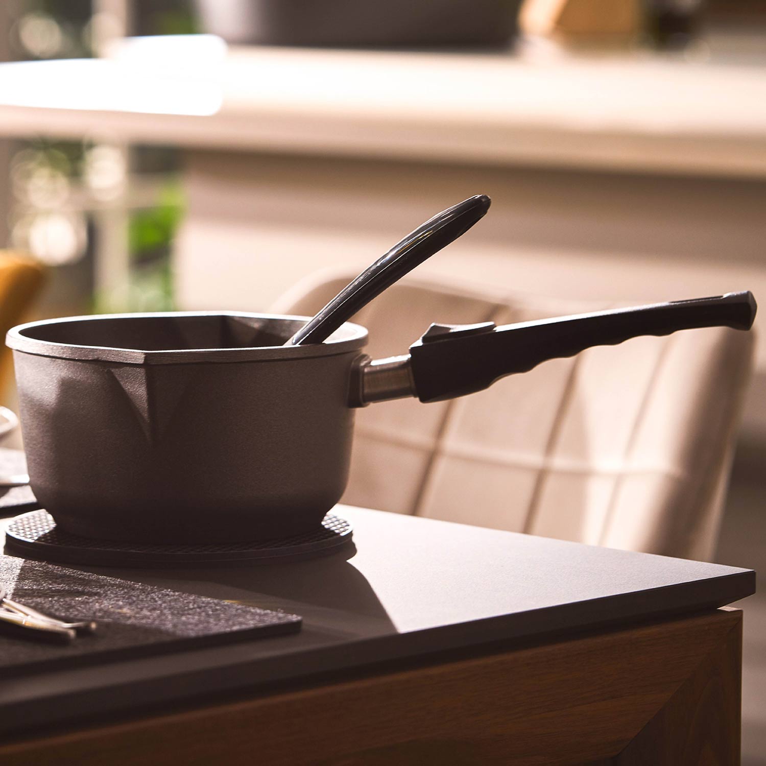 Ihr neuer Kochtopf wird bis in den äußersten Rand heiß und kann sogar bis zu 240°C in den Backofen. Mit unserem Kochgeschirr wie dem Michtopf mit zwei Ausgießern sind Sie optimal ausgestattet. Er ist wie alle Kochtöpfe Induktion aus unserem Shop für alle Herdarten geeignet. In ihm können Sie neben Saucen auch Milchprodukte aller Art verarbeiten. Sie möchten Milch erhitzen oder Milchreis zubereiten? Mit der Stielkasserolle kein Problem. Es handelt sich um einen Aluminiumtopf mit Deckel, der sich hervorragend für die Zubereitung von Desserts eignet.