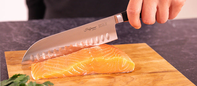Zu dem Sammelbegriff Allzweck-Messer gehören große Küchenmesser, die Sie für nahezu jedes Lebensmittel nutzen können. Unsere Chefmesser (auch Kochmesser genannt) und das Santoku-Messer gehören zu dieser Kategorie. Kleinere und schmalere Kochmesser finden Sie auch unter dem Namen Office-Messer. Das Chefmesser erhalten Sie bei uns entweder mit einer 21 oder einer 16 Zentimeter langen Klinge. Die Größenauswahl richtet sich nach Ihrer Handgröße sowie der Menge der zubereiteten Speisen. Bei großen Mengen könnte das größere Küchenmesser mit der Zeit schwerer in der Hand liegen. Die Klinge des Chefmessers läuft spitz zu, während die des Santoku-Messers durchgehend breit und mit einem Kullenschliff versehen ist. Der besondere Schliff verhindert, dass haftende Lebensmittel, zum Beispiel Kartoffelscheiben oder Käse, an der Klinge kleben bleiben. Die Spitze dieses Messers ist abgerundet.