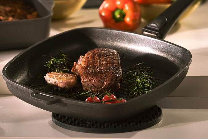 Recyceltes Aluminium als Ausgangsmaterial stellt sicher, dass sich Hitze schnell und gleichmäßig bis in den Rand verteilt. Zugeführte Wärme wird langfristig in unserem massiven Guss gespeichert und sichert Ihnen beste Röstaromen, selbst wenn kalte Zutaten angebraten werden.