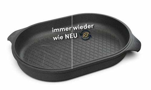 Die enorme Lebensdauer ist auf die robuste Materialwahl und die hohe Verarbeitungsqualität "Made in Germany" zurückzuführen. Durch die hitzebeständige Form in Kombination mit dem durchdachten Thermoboden verteilt sich die Hitze gleichmäßig in der Form. Das ist für ein perfektes Ergebnis besonders wichtig, damit der Inhalt in der Platte nicht ungleichmäßig gegart wird. Außerdem verziehen sich die Platten nicht, sodass diese im Idealfall ein Leben lang nach dem Kauf zum Einsatz kommen können.