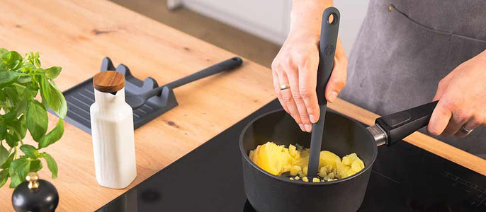Entdecken Sie, wie einfach und mühelos Kartoffelstampfen sein kann: Die große, gerade Auflagefläche des Stampfers ermöglicht es, den vollen Druck präzise einzusetzen – so verwandeln sich Kartoffeln und Gemüse schnell in cremiges Püree. Trotz der wirkenden Kräfte bleibt Ihr Kochgeschirr geschützt, denn die weiche Silikonummantelung verhindert Kratzer und sorgt für ein schonendes Arbeiten.