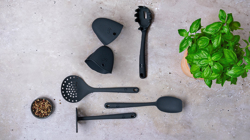 - Enthält: Pastalöffel, Schaumlöffel, Kartoffelstampfer, Soßenlöffel und Fingerschutz für heißes Kochgeschirr