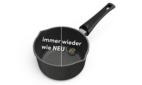 Nicht jede Antihaft-Beschichtung ist gleich und es zeigen sich Unterschiede in Qualität, Kratzfestigkeit, Langlebigkeit und vor allem im Herstellungsprozess. Unsere Antihaft-Beschichtung für unseren Stieltopf und weiteres Kochgeschirr, verfügt über ein dreischichtiges und keramik-verstärktes Antihaft-System. Diese besonders kratzfeste und langlebige Antihaft-Beschichtung wurde für den professionellen Einsatz in Gastronomieküchen entwickelt und wird auch dem intensiven Haushaltsgebrauch mehr als gerecht.