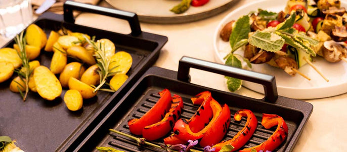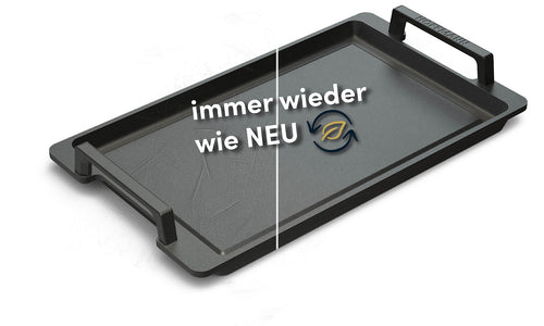 Beachten Sie, dass die Griffe aus Gusseisen sich durch die optimale Wärmeleitfähigkeit des Materials bei der Erhitzung auf dem Herd oder im Backofen miterwärmen. Nutzen Sie daher Topflappen oder Ofenhandschuhe, wenn Sie erwärmte Grillplatten anheben möchten. Grillplatten aus Gusseisen oder Aluminium sind auch für empfindliche Speisen geeignet. Bei einer Edelstahl-Grillplatte fehlt jedoch oftmals eine Antihaftbeschichtung. Hier ist zu bedenken, dass empfindliches Bratgut wie Lachs oder auch Champignons möglicherweise an der Grillplatte haften bleiben. Unsere Herd-Grillplatte verfügt über eine erstklassige Antihaftbeschichtung. Sollte diese einmal beschädigt werden, nutzen Sie unseren Wiederbeschichtungsservice. Dies schont nicht nur die Umwelt, sondern auch den Geldbeutel.