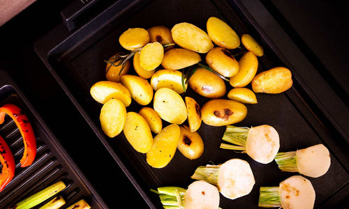 Unsere Grillplatte aus Aluguss ist trotz ihres Hauptbestandteils Aluminium für den Einsatz auf allen Herdarten geeignet. Die spezielle Suche nach einer Grillplatte für Induktion oder einen Gasherd erübrigt sich daher. Platzieren Sie die Grillplatte einfach auf zwei benachbarten Kochfeldern oder auf einem ovalen Kochfeld. Das Material sorgt für eine gleichmäßige Hitzeverteilung, auch bei zwei getrennten Kochfeldern. Dreizehn Grillstreifen erzeugen beim Braten das charakteristische Streifenmuster auf dem Grillgut. Zwischen ihnen sammelt sich der ausgetretene Saft, der durch die Hitze verdampft. Die Aromen ziehen direkt zurück ins Fleisch oder Gemüse. Dieser Effekt ist mit einer herkömmlichen Pfanne nicht zu erreichen. Hier sammelt sich die ausgetretene Flüssigkeit auf dem Pfannenboden und das Grillgut schmort im eigenen Saft. Möchten Sie jedoch Eier oder Pfannkuchen zubereiten, verwenden Sie am besten eine Pfanne oder eine Grillplatte mit geschlossener Form ohne Grillstreifen, da diese Zutaten eine glatte Ebene zum Braten benötigen.
